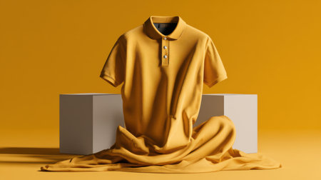 A mustard yellow polo shirt mockup, draped over a modern, geometric object.
