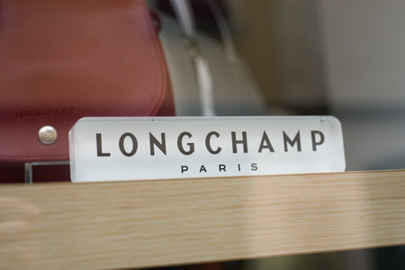 Mulhouse - France - 14 June 2020 - Closeup of Longchamp logo in a luxury fashion store showroom