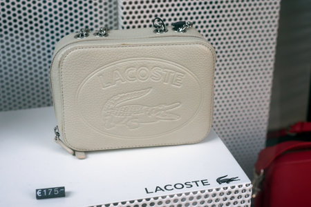 Mulhouse - France - 21 June 2020 - Closeup of beige leather bag by Lacoste in a luxury fashion store showroom