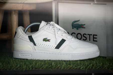 Mulhouse - France - 30 May 2021 - Closeup of white sneakers by Lacoste in a sportswear store showroom