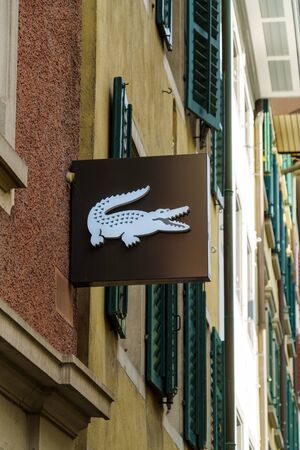Lucerne, Switzerland - October 19, 2017: A sign of Lacoste with a crocodile on the wall of a house on the street