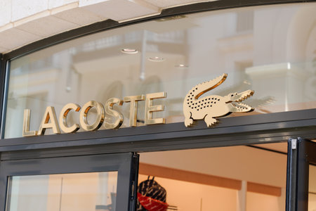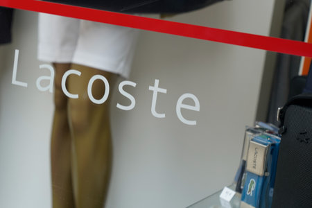 Basel - Switzerland - 7 February 2020 - Closeup of Lacoste logo on fashion store front in the street