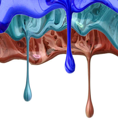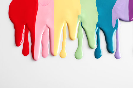 Various shades of paint drip down in an arrangement, creating a colorful display. The paint includes hues of pink, red, and purple, highlighting a playful artistic flair on a clean surface. 3d render