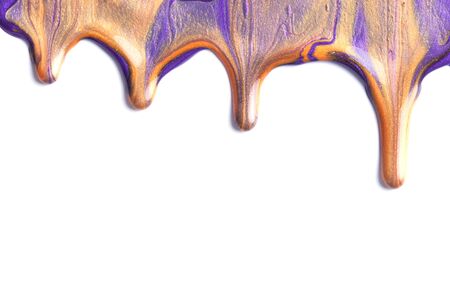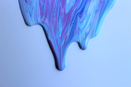 Light blue liquid drops of paint color flow down on isolated very peri background. Abstract violet backdrop with fluid drip pattern. Acrylic painting with copy space.