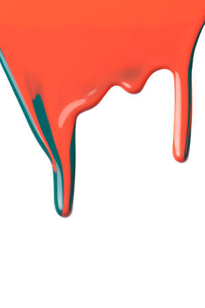 Bright red liquid drops of paint color flow down on isolated white background. Abstract scarlet backdrop with fluid drip pattern. Acrylic painting with copy space.