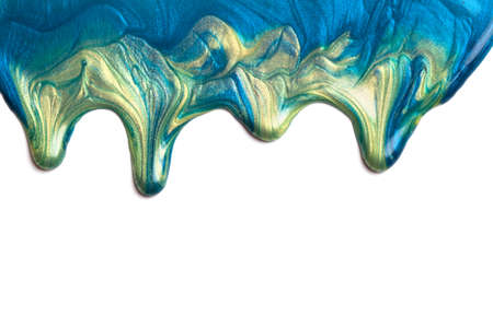 Liquid ink flows down white canvas. Fluid art background with mix of light blue and golden tints. Acrylic paints flows to down. Cyan gold abstract backdrop. Mixing of glitter colors. Aqua with gilding