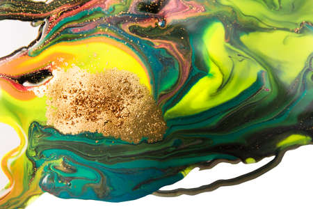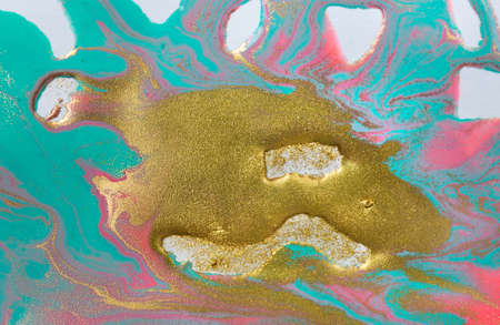 Abstract bright shiny color fluid background, hand drawn alcohol painting with golden streaks. Liquid ink technique texture for high resolution backdrop design