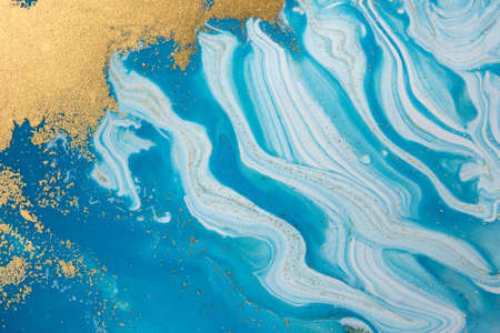 Marbled blue and golden abstract background. Liquid marble pattern. Agate, paint.