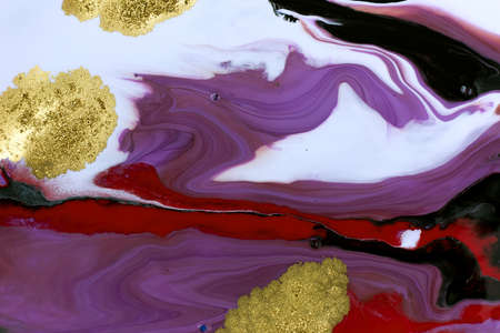 Marble abstract acrylic background. Purple and white marbling artwork texture. Agate ripple pattern. Gold powder.