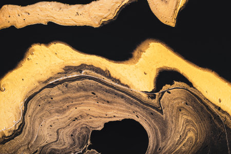 Golden slice of stone on black. Abstract liquid marble background or texture. Acrylic Fluid Art. Digital decor