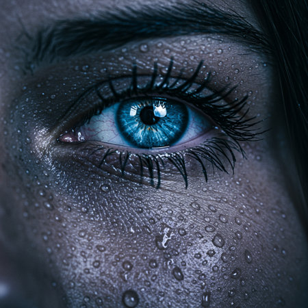 Mesmerizing closeup showing a human eye with water droplets, intricate details, a blue and green iris, featuring an intense gaze concept