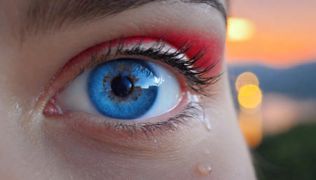 This captivating close-up image showcases a human eye with striking colors and golden makeup highlights, evoking deep emotion and beauty.