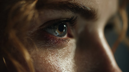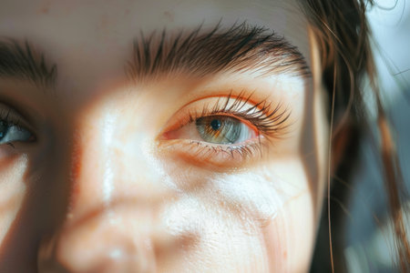A close view of a single eye showcases a tear rolling softly down the cheek, capturing profound emotion. The detailed textures of the skin and eyelashes enhance the natural lighting and realism.