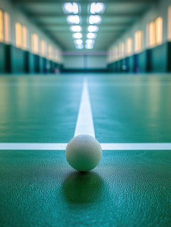 Tennis court with ball on the floor. Blurred background.