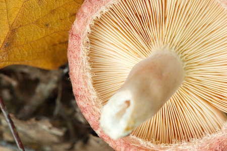 Woolly milk cap, Lactarius torminosus, with its characteristic drops of milk. Leon, Spain