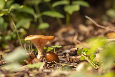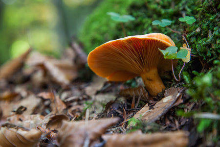 The orange mushroom a coral milky cap growing in wood an autumn season, sunny day