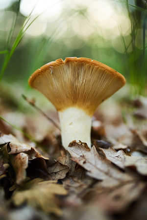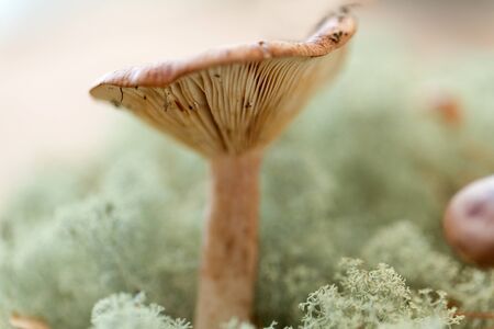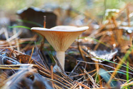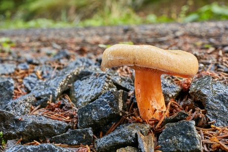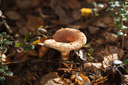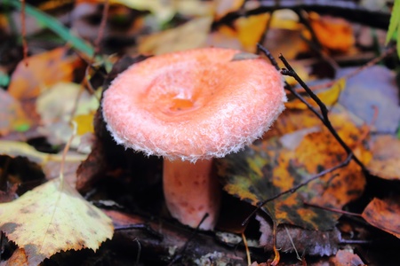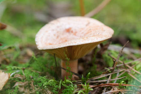 Closeup of edible mushroom peppery milk-cap on forest floor