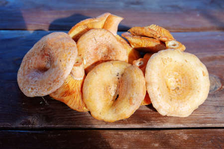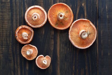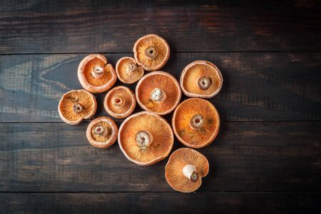 Edible mushrooms - Saffron Milk Cap on rustic brown wooden table. Top view.