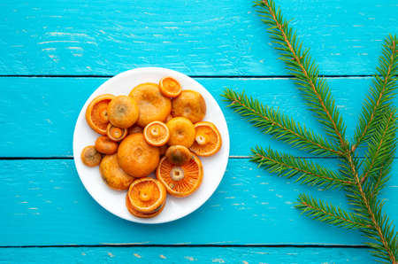 Fresh mushrooms orange milkcap or false saffron milkcap, Lactarius deterrimus on plate, blue wood board background with spruce branch for decoration. Flat lay view, copy space.