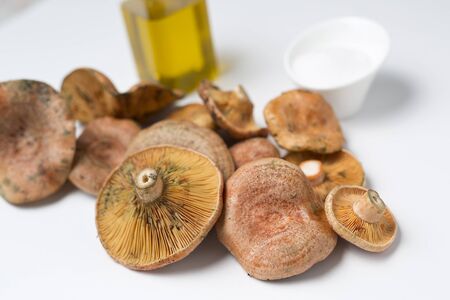 White Lactarius resimus mushroom genus Lactarius family Russulaceae. Natural background of raw peeled mushrooms, close-up