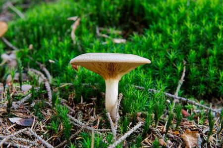Small mushroom in a forest on green moss with dry leaves. Macro photo shoot of nature.