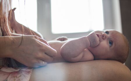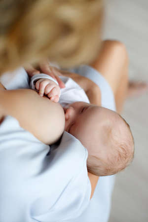 Breastfeeding concept. Portrait of a newborn baby. Mother holds a child in her arms. The first year of life. Care and health.