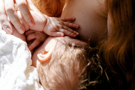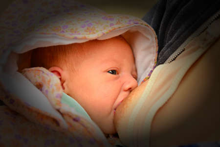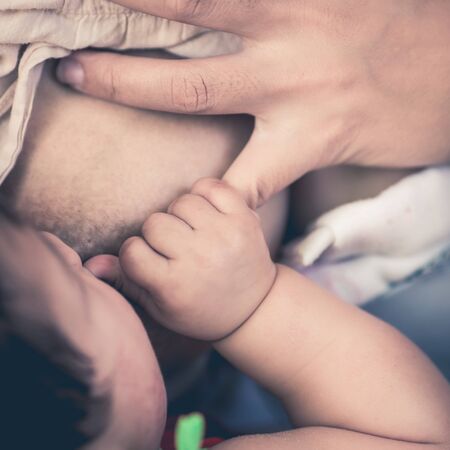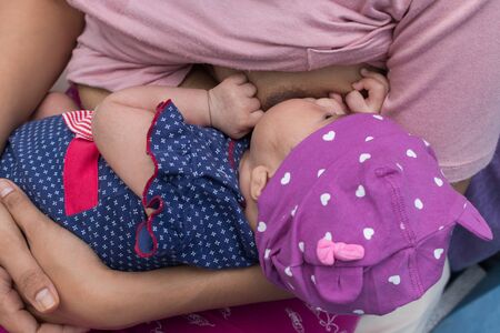 Newborn baby girl during breastfeeding, helping herself with her hand