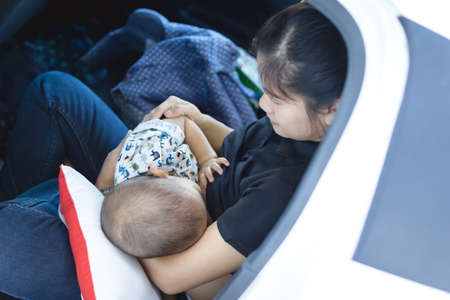 Asian Young Mother wearing Protective face mask breastfeeding her baby son while sitting in the car.