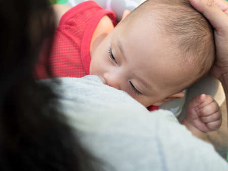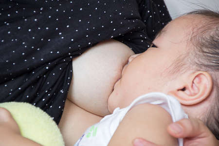 A 1.5 month old Asian baby is happy to suck breast milk.