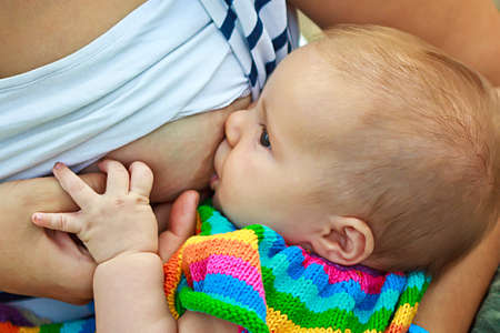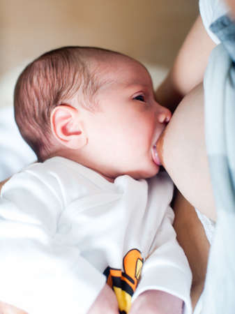 baby boy sucking milk from mothers breast. Portrait of mom and baby. Concept of healthy and natural baby breastfeeding nutrition.