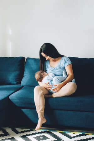 Woman mother breastfeeds an infant baby sitting on a home sofa. Mom feeds milk toddler baby in living room