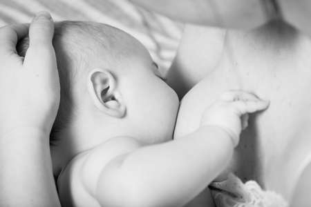 Newborn baby is breast feeding. Selective focus on the baby face. Black and white photo.
