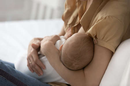 Crop close up of loving young Caucasian mother sit in bedroom hold in arms cuddle lull little newborn son or daughter. Caring mom relax hug small baby infant breastfeed child. Motherhood concept.