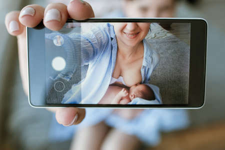 mother breastfeeding mobile photo newborn baby concept. family memories selfie.