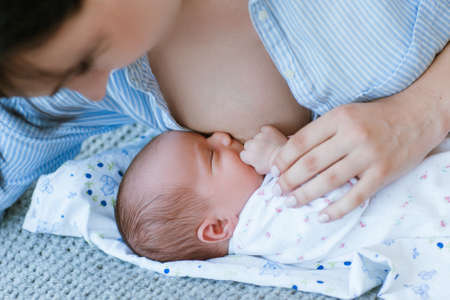 A young mother is breastfeeding her newborn baby while lying on the bed. Care, childhood, motherhood
