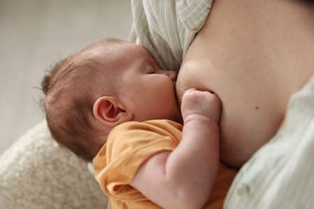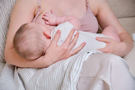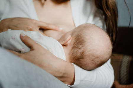 Closeup of a young mother breastfeeding her newborn baby at home in the living room