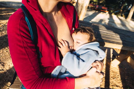Little girl feeds on her mother's breast milk by breastfeeding.