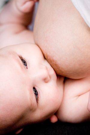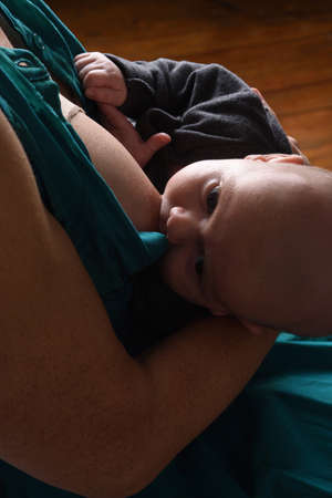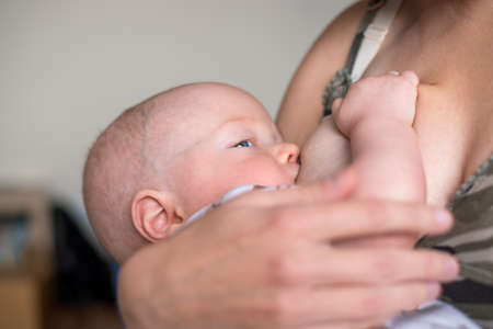 Mother breastfeeding her baby boy while holding him for his tiny arm