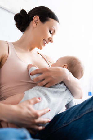 Young mother breastfeeds her baby, holding him in her arms and smiling from happiness