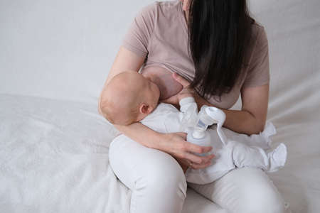 A young woman holds a newborn baby in her arms and breastfeeds.Mother pumping milk to bottles by Automatic breast pump machine