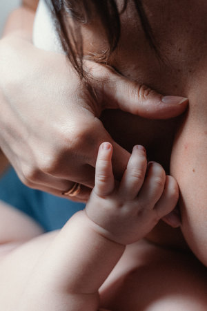 Close-up of a mother's hand gently supporting her breastfeeding baby. The image captures the delicate connection, focusing on the baby's tiny fingers and the mother's nurturing touch