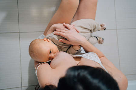 breastfeeding. top view. mother feeds baby with breast milk sitting on floor