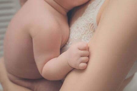Children's hand close-up. Mother with a baby in her arms. Moment of tenderness.