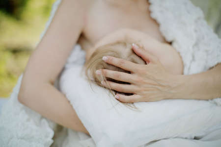 Young happy mother in white house dress with short sleeves, sitting on the bed, tenderly holding his newborn son, the baby sucks mother's breast and falls asleep, the child is dressed in white overalls, a small stick is lying on the mother's breast