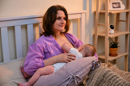 A woman mother is breastfeeding an infant baby while sitting on a home bed at night. Mom feeds milk toddler baby in the light of the evening lamp