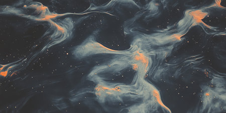 Glimmers of a starfield illuminate a cosmic texture with swirling colors in a dark expanse
