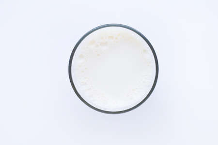 Small glass milk bottle with cap held in hand by Caucasian male. Close up studio shot, isolated on gray background.