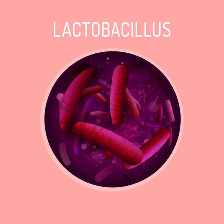 Lactobacillus probiotics. Normal gram-positive anaerobic flora. Editable vector illustration with lactobacillus in violet colors isolated on pink background. Medical, healthcare, scientific concept