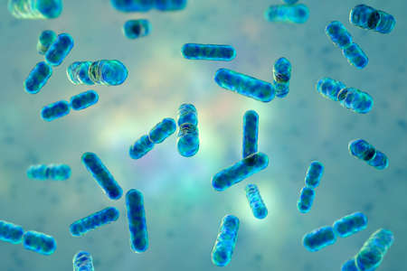 Scientific image of bacteria Corynebacterium showing their characteristic morphology, rod-shaped bacteria with wider ends and club shape appearance, 3D illustration. C. diphtheriae and other