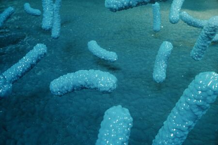 3 d illustration of bacteria in microflora. Blue bacterium on a red surface. Close up.